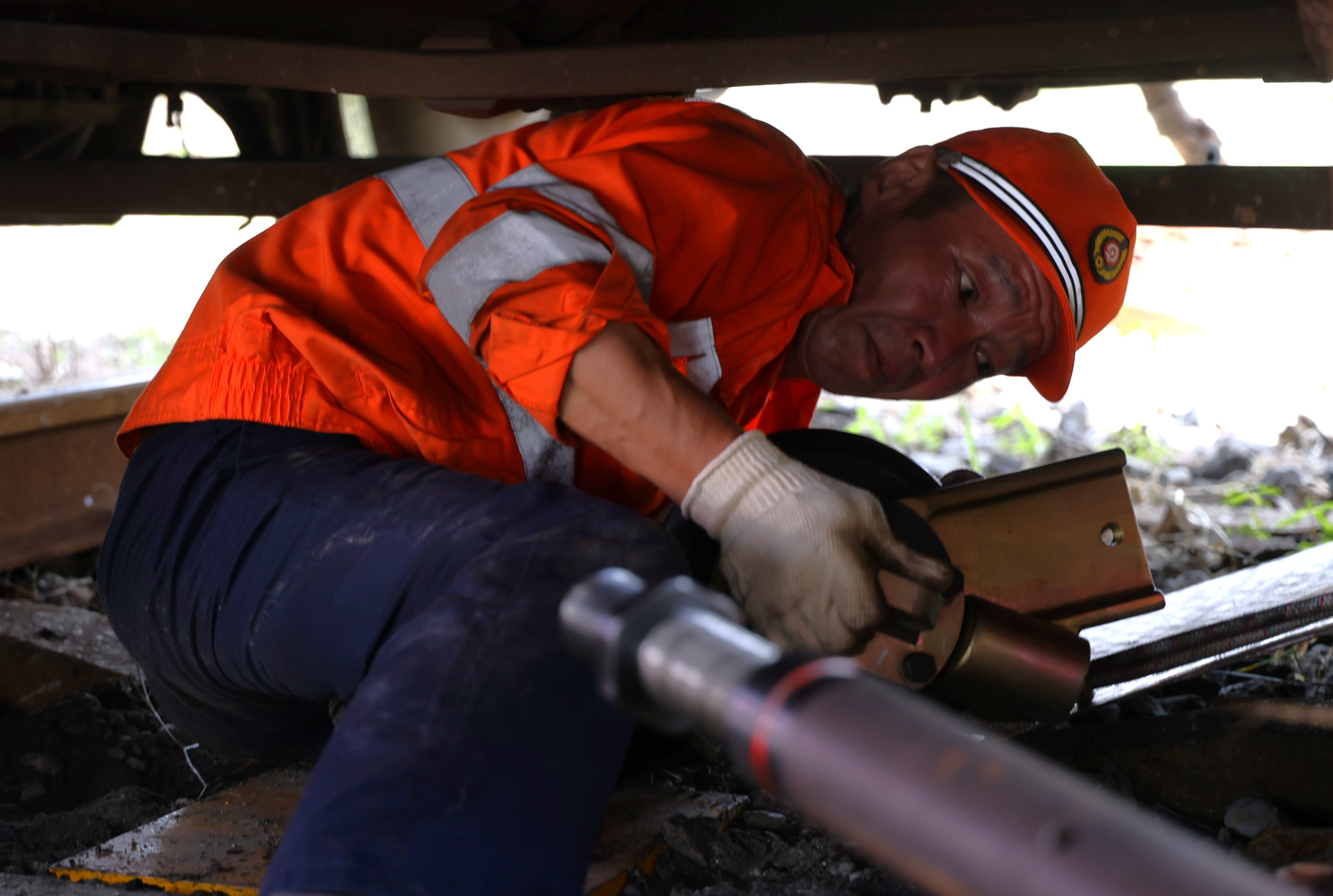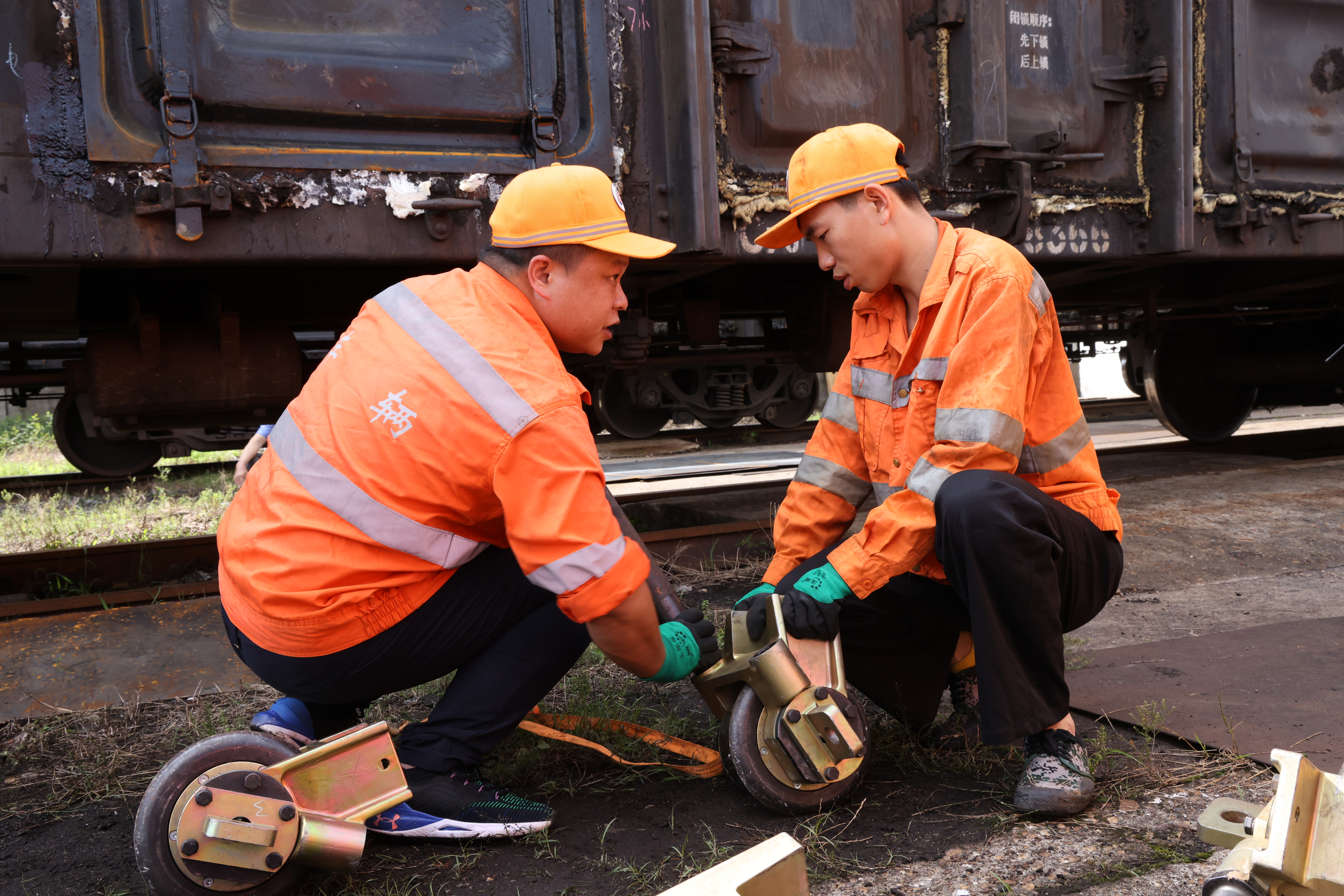 赣州东运用车间作为首发队伍,压力不言而喻。“工具都搬下来,计时开始了!”带队干部黄浩的喊声透着不容置疑的紧迫。阳光直射下,他额角渗出细密的汗珠,眼神紧锁着每一个环节。“小王,检查车辆,找出故障轮对!”“小刘,跟人组装配件!”收到指令后,队员们立即行动,身影在空旷的股道间快速穿梭。工具碰撞发出清脆的“叮当”声,打破了短暂的沉寂。“找到了!”小王确认故障轮对后,一个猫腰便钻入车底。千斤顶迅速到位,他撸起袖子,双手上下不断来回起伏,轮对被稳稳顶离轨面一小段距离。“千斤顶到位!”小王的报告声刚落,众人的几双手臂同时发力,沉重的悬轮装置被迅速、精准地抬放至轨面上。小刘和队友手中的扳手随即飞速旋转,“咔哒、咔哒”的紧固声密集响起,装置严丝合缝地贴紧了轮对。汗水浸湿了工装,队员们或蹲或跪,眼神交汇间是无需言语的默契,相互支撑、紧密协作。“落!”随着一声指令,千斤顶缓缓收回。故障轮对稳稳当当地落在了悬轮装置上,纹丝不动。
