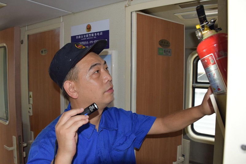 客车检车员正在对列车车厢内灭火器压力表进行检查