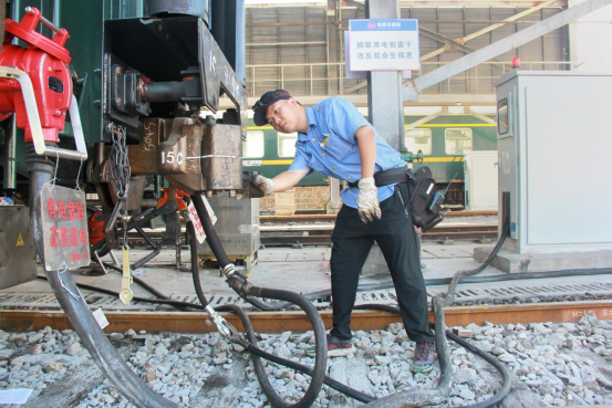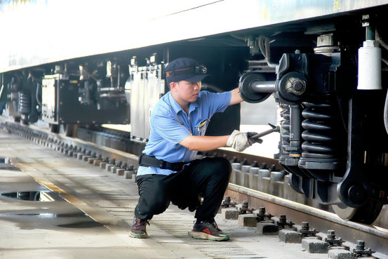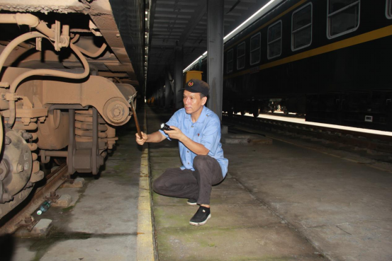 客车检车员正在检查车钩钩舌情况(叶琳艳 摄)