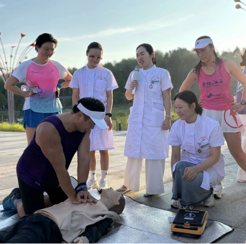 待晨跑渐歇,急诊医学科医护团队向跑友开启急救教学,他们先是结合跑友运动场景,细致演示心肺复苏的按压姿势、呼吸辅助步骤,以及AED的开机、电极片粘贴等关键操作,每一个动作都配合清晰讲解;演示结束后,随即邀请跑友分组在模拟人上开展“实战”演练,医护人员全程紧盯,一对一俯身指导,针对按压位置偏移、力度不足、频率过快等问题实时纠正,手把手帮助跑友掌握规范操作要领。