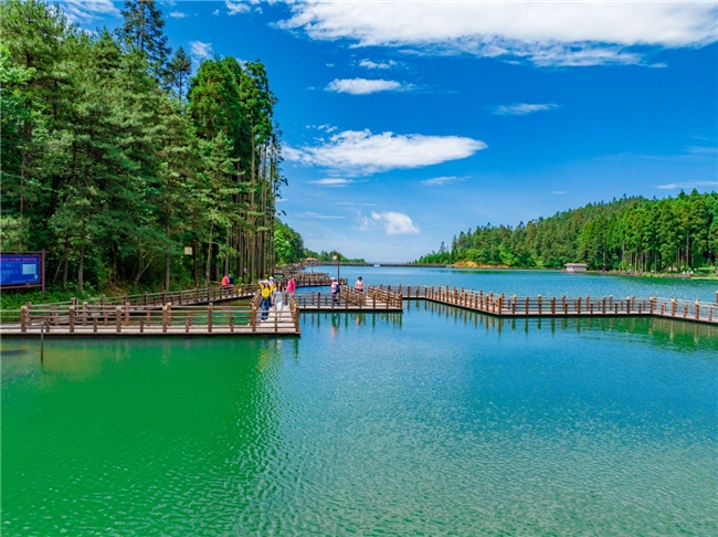 登高首选青云栈道,3100米的栈道沿绝壁蜿蜒,脚下是万丈深渊,身旁是层林尽染的山岳,登顶后极目远眺,可见峰峦如黛、云海翻腾,将“苍松斗妍、山花织锦”的四绝景观尽收眼底。待到夜幕降临,明月升空,景区“以月亮情吸引人”的理念在此刻具象化——山月相融的意境愈发浓郁,坐在山间石阶上,听松涛阵阵,看月色洒在竹海与飞瀑上,偶有流泉潺潺入耳,构成秋日最惬意的“人月共欢”图景。