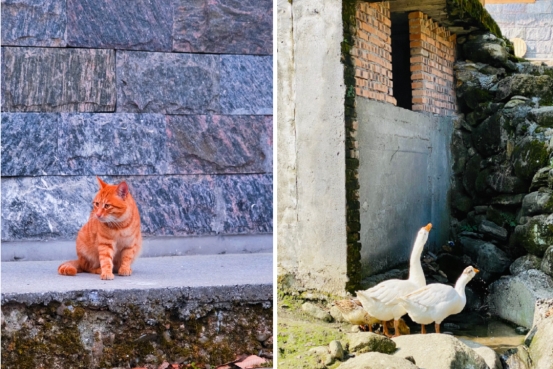 村内石板小道蜿蜒,橘猫、大白鹅等小动物悠闲踱步,仿佛“村主人”般自在;家家户户房前屋后种满绿植,流水淙淙穿村而过,阳光洒落时溪水波光粼粼。春夏秋三季,不少家庭在此露营野餐,与自然亲密接触;农家乐的特色菜肴更不容错过——熏猪肉锁住了柴火的香气,轻轻一咬便有汁液迸发,水磨豆腐由新鲜黄豆手工打磨,细腻爽滑且豆香浓郁。一日之内,可在古树下纳凉、溪水边漫步、品尝农家菜,感受“遗世独立”的闲适。
