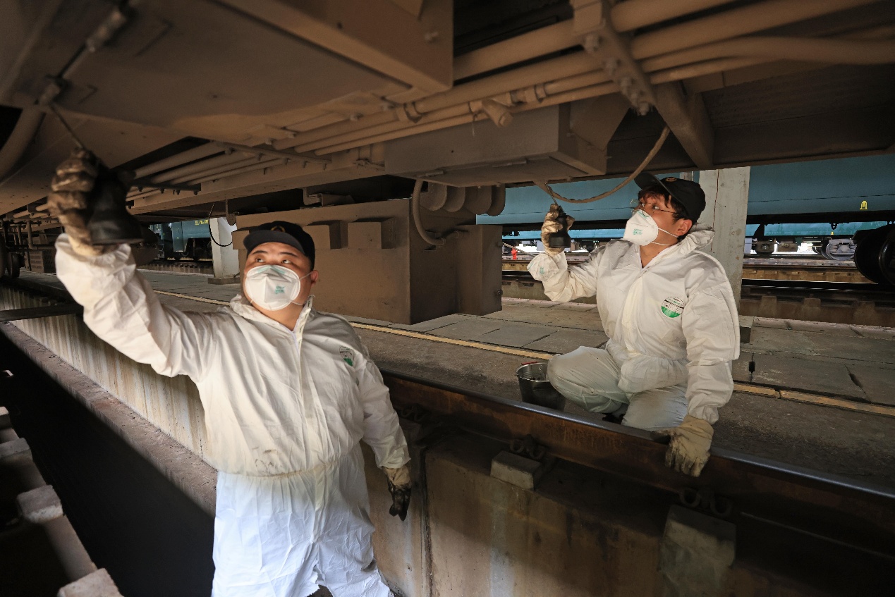 客车检车员为车下电力分线盒开盖除尘 王超摄