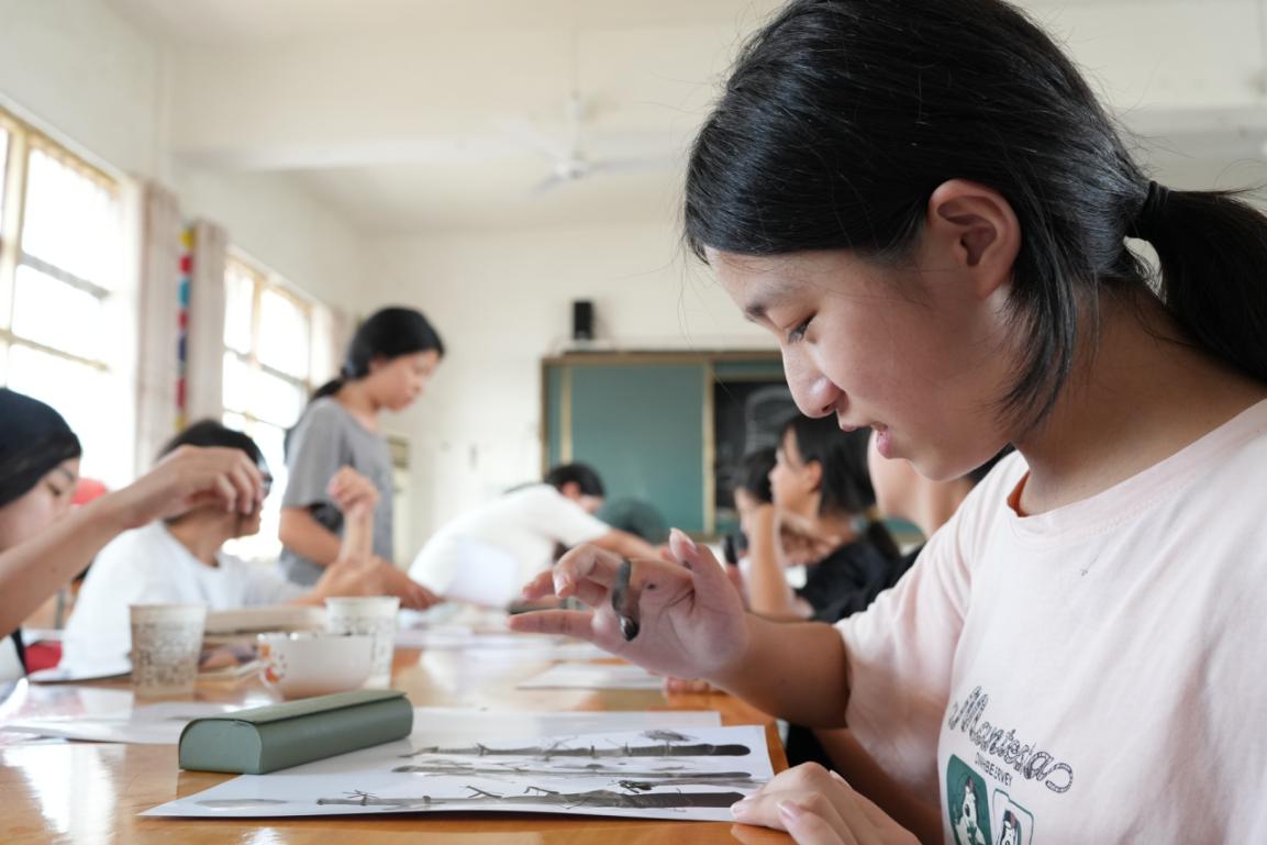转机始于2018年,奉新县将干洲手指画列入县级非物质文化遗产名录。政府不仅帮着办展览,还在学校开了兴趣班。在此前的一个学期年度里,同样是县非遗文化传承人的余石根老师的奇石赏析课激发了同学们对传统文化浓厚的兴趣。本学期,李猛则成了美术课堂“客座老师”,每周五下午都去给孩子们上课。他教孩子们用食指画小鸡的绒毛,用小指勾柳条的细枝,有个叫妞妞的小姑娘,第一次用手掌拓出一朵墨荷后,举着画追着他喊:“老师,我的手会开花啦!”现在,镇上的文化站里常能看见祖孙同画的场景,老人们教技法,年轻人用短视频拍创作过程,指尖的墨香,正顺着屏幕飘向更远的地方。