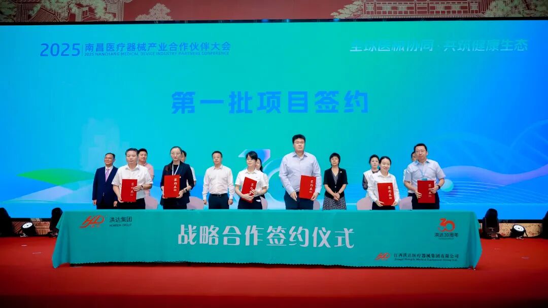 大会第一阶段的战略合作签约环节亮点纷呈。在南昌市人民政府副市长余红艳、进贤县委副书记、县长熊辉等领导的共同见证下,洪达集团领衔签订六大战略合作协议,涵盖智能化血液透析整体解决方案、医用高分子材料供应链、中空纤维透析器产业链、产学研融合、血透智能设备智造、营销战略等多个维度,合作方包括深圳暨华、中国石油天然气股份有限公司、苏州关怀医疗、南昌大学医疗器械产业创新学院、迈得医疗、云南和誉商贸等产业链关键主体。
