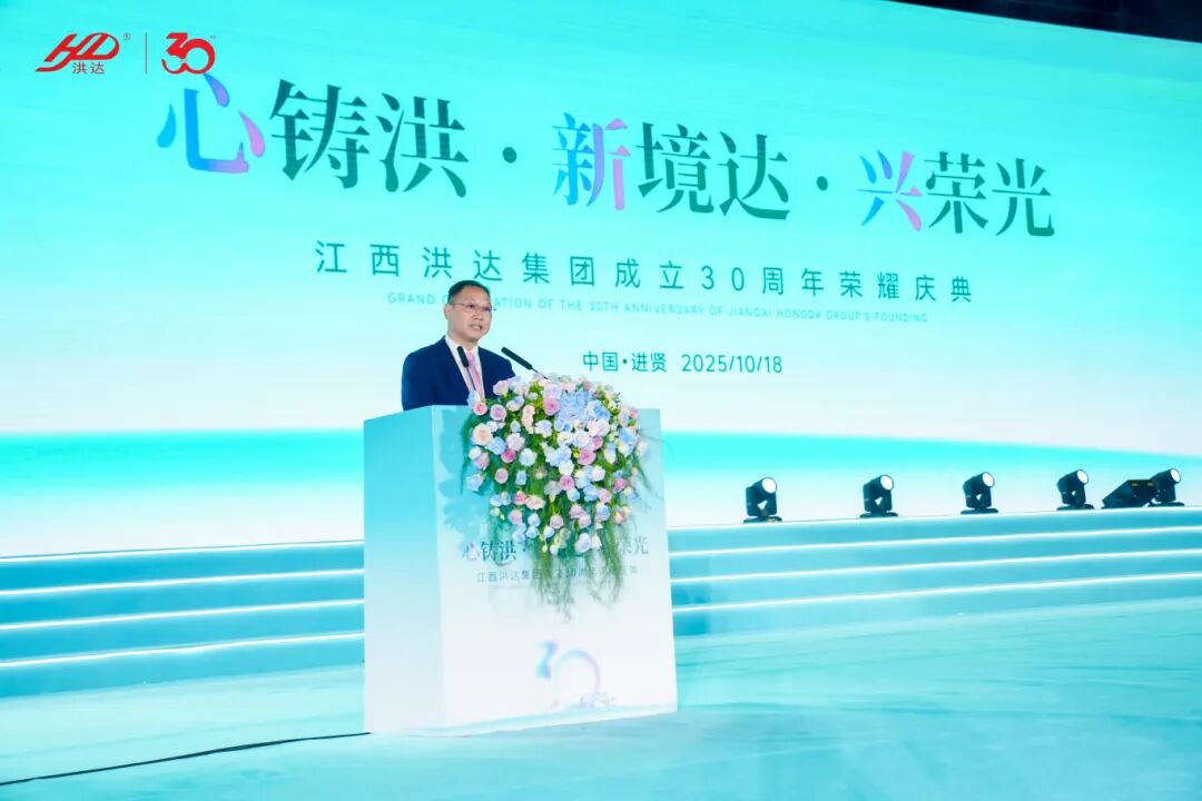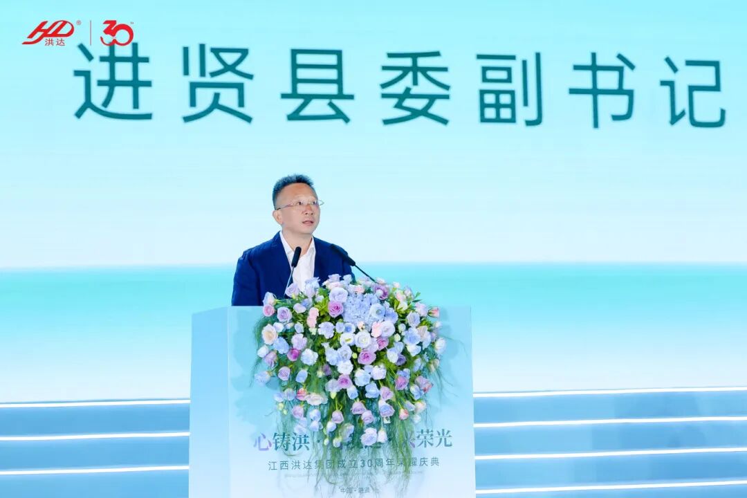 洪达集团董事长王江华致辞:“1995年至今,洪达从作坊成长为行业标杆,离不开员工拼搏、伙伴支持与领导关怀,三十而立是扛起医疗责任的新起点。”