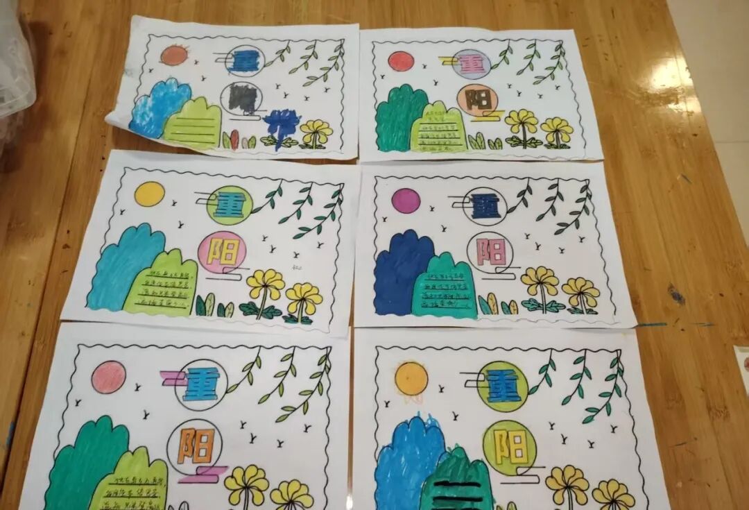 活动室里满是专注的小身影。孩子们握着童伴妈妈递来的画笔,在白纸上尽情勾勒重阳的模样:“重阳”二字被涂得格外鲜亮,青山是深浅不一的绿,黄花晕染出明媚的黄,飞鸟在天际留下灵动痕迹……每一笔色彩里,都藏着他们对节日的好奇,也记着志愿者们轻声讲述的“孝敬老人”小故事,把对爷爷奶奶、外公外婆的祝福,一笔一画地装进了缤纷手绘里。