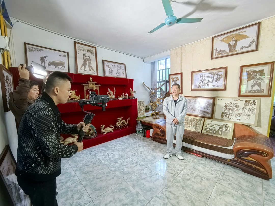 随后,团队探访了竹衣贴画非遗代表性传承人陈亮的工作室。出身雕匠世家的陈亮,自幼便与竹艺结下了不解之缘。从捏泥启蒙到美术学府深造,最终他选择回归故土,将数十载光阴倾注于竹衣工艺的传承与创新。