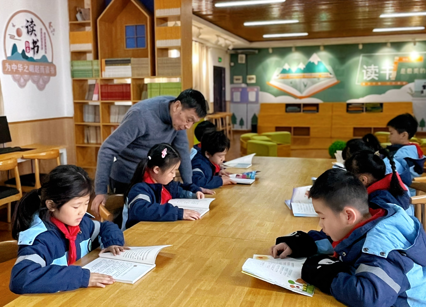 (退休教师程其金利用课余时间指导学生进行阅读)