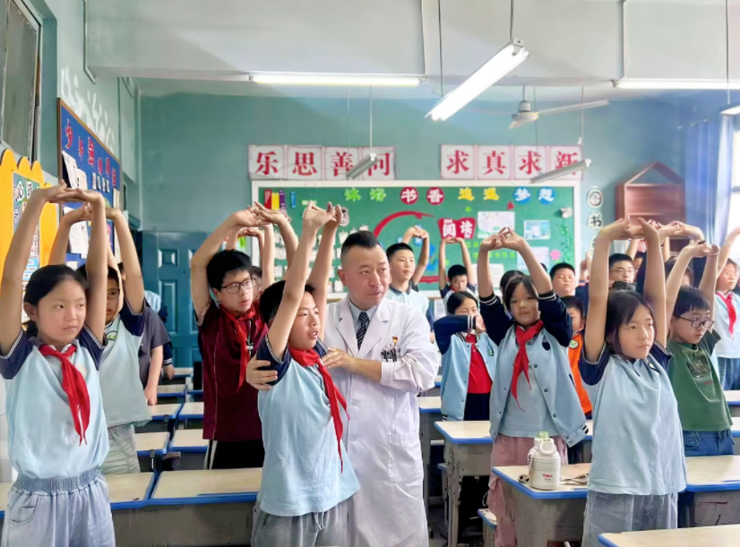 (学生家长在新世纪小学普及脊柱健康知识)