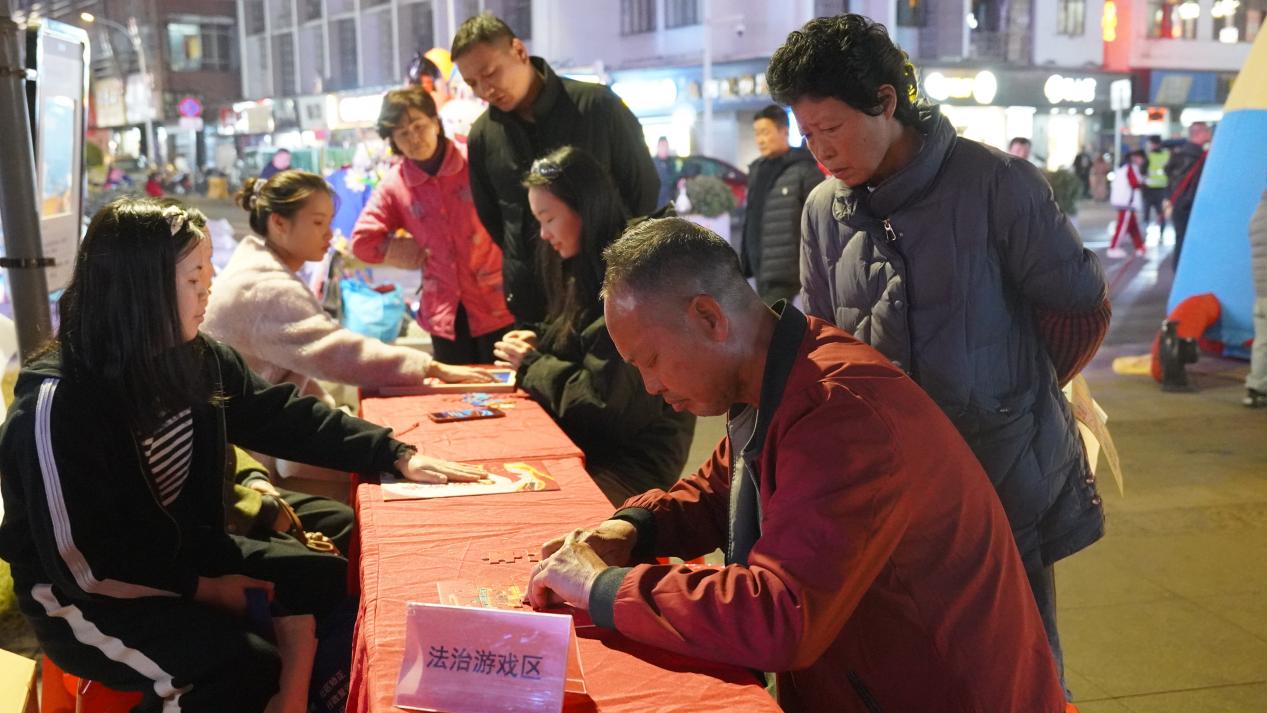法治游戏互动区里,飞行棋、拼图等好玩的游戏让大家玩着就能学法律知识。市民甘先生正低着头拼法治主题拼图,一块块印着宪法字样、法律标识的拼图片,在他手里慢慢凑成了完整的一幅。拼完后,他拿着奖品笑着说:“这拼图不光好玩,还能顺便学些法律知识,收获真不小。以前的普法都是念条文,听着就犯困,现在这样多好,游戏、表演都是大家爱瞧的,轻轻松松就把法律知识学了。希望以后多办些这样的活动。”