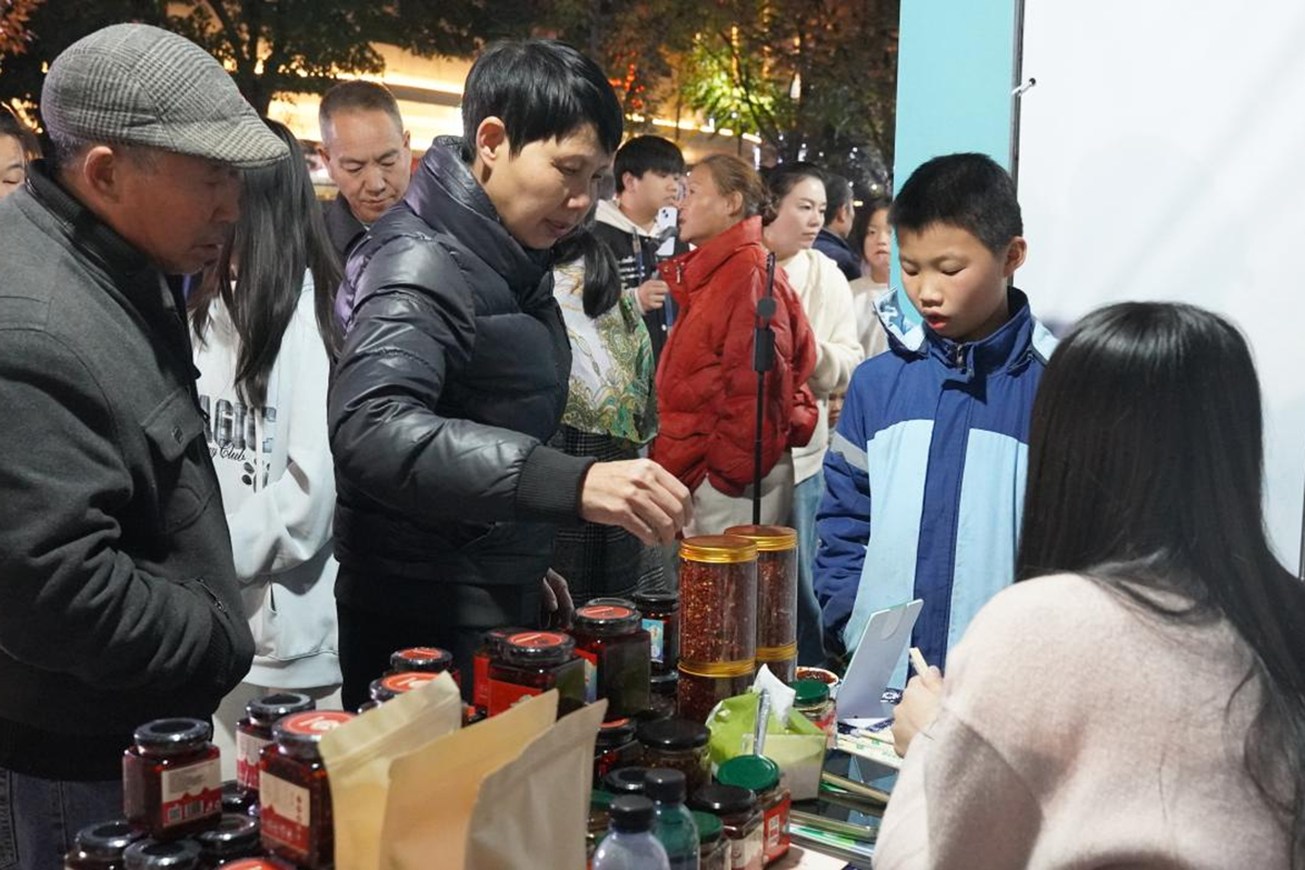 挤在人潮里,随着鼓点挪进巡展长廊,“百县百味”招牌下人头攒动。来自长潭村的江西省辣都餐饮管理有限公司摊位前,工作人员刚舀起一勺泛着红油的小鱼仔,香辣味瞬间勾得食客层层围拢,“多装两瓶,拌面条香!”“这小鱼仔够劲,再给我来三瓶!”的喊声此起彼伏。摊位上,新品“辣都武功山小鱼仔”最是抢手,透明玻璃瓶里,小鱼裹着鲜红辣酱,不到半小时就补了两次货,成了当晚妥妥的“销量王”。“除了这爆火的小鱼仔,我们还有‘添小狗’‘辣婆佬’这些牌子,年轻人爱新潮的‘添小狗’,45岁以上的乡亲就认老配方的‘辣婆佬’,各有各的受众!”工作人员忙着打包,手上动作不停:“今晚单是这‘辣都武功山小鱼仔’,就卖出去好多瓶,好多游客说要带回去给家人尝尝鲜!”这家辣文化农业企业,今年10月才入驻五陂镇,携手长潭村的江西省老渡口农业科技发展有限公司,借着五陂镇农文旅融合发展的东风,让本土辣味香飘文旅盛宴,也让村集体经济有了新增长点。