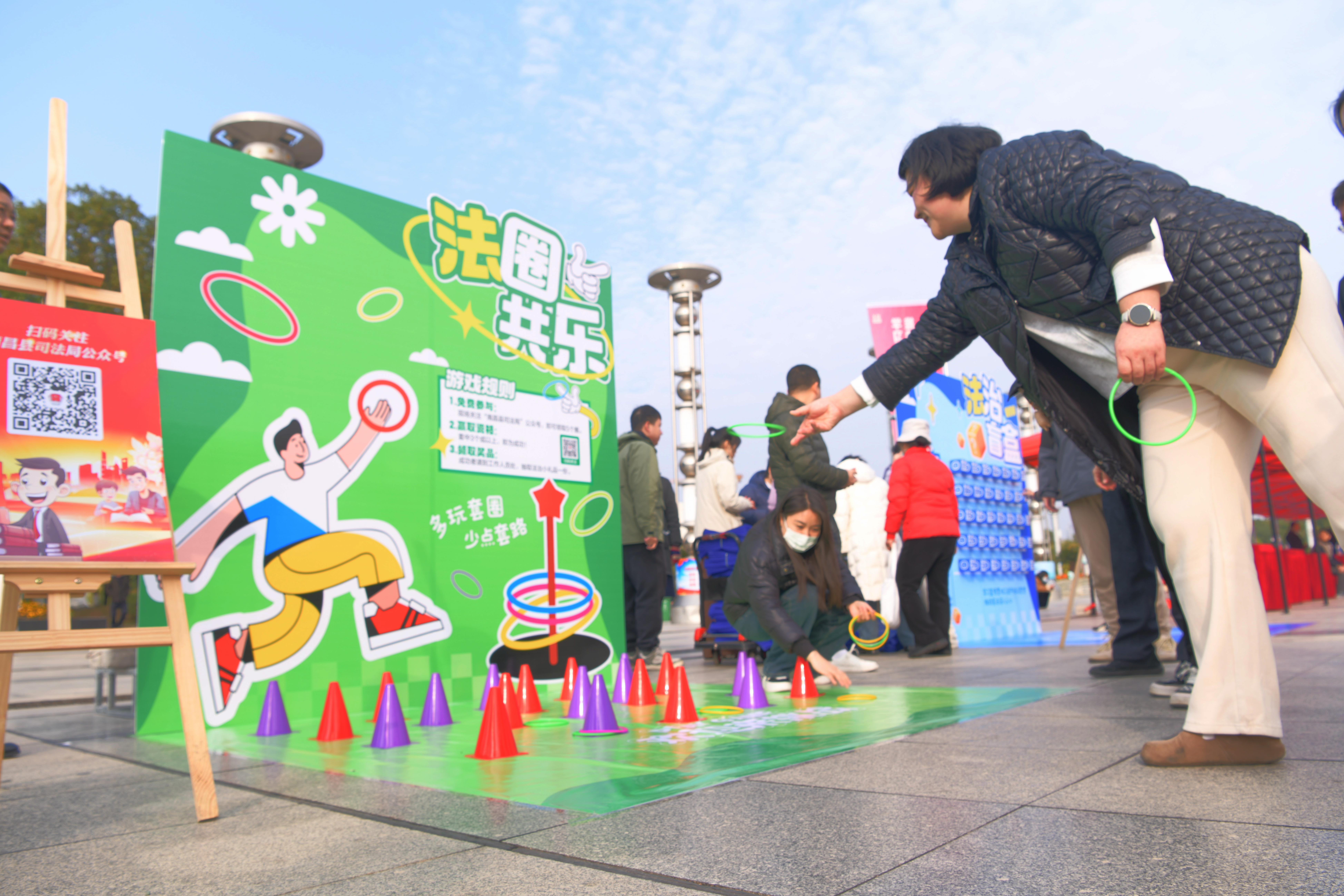 -普法套圈互动板块:规则简明,趣味性强。群众现场关注“南昌县司法局”微信公众号即可获得参与机会。成功套中目标者,欢天喜地前往工作人员处抽取法治礼品,欢声笑语不绝于耳。