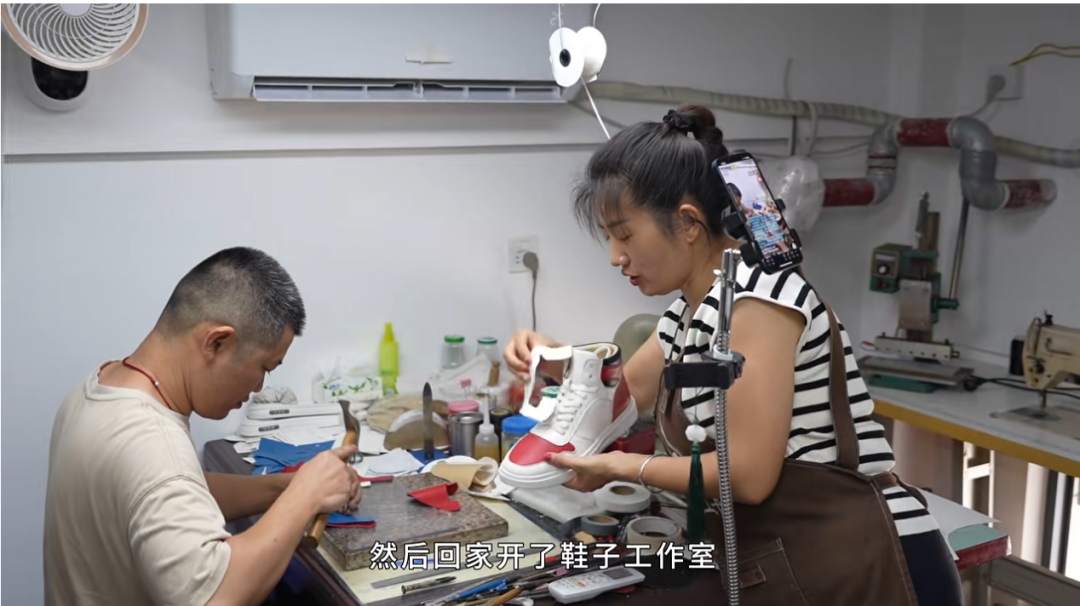 就这样,“胡同鞋匠”小店开张了。起初,生意并不好,一天下来也见不到几个顾客。胡斌负责做鞋,杜锦就学着拍抖音短视频,分享做鞋的过程和鞋子的款式。“当时我们都想过要不要再回东莞。”杜锦说,一次刷抖音时,看到有人通过短视频卖手工制品,她突然意识到:“现在都是互联网时代了,咱不能守着店等顾客,得主动找顾客。”从没拍过视频的杜锦,开始跟着网上的教程学习。每天等孩子睡后,她就拿着手机在店里练习拍摄——胡斌裁剪皮革的特写、鞋子缝合的细节、成品鞋的试穿效果,都成了视频素材。“第一次直播时,我紧张得话都说不利索,镜头都不敢看,播了10分钟就匆匆下播了。”杜锦笑着回忆,但当有网友在评论区问“能做加宽的鞋吗”,她立刻露出笑容,眼睛弯成了月牙:“当然可以!您把脚长、脚宽告诉我,我们还能根据需求调整鞋底软硬度呢!”那抹真诚的笑,让不少网友停下了滑动的手指。