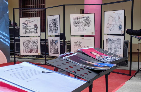 展览现场右边的书画区展架上悬挂着美育小组组织的城乡儿童联合创作的绘画作品。一笔一画间,既有艺术的精粹,也有童真的想象,更凝聚着城乡文化交融的温暖印记。左边一角的小展架上整齐陈列着赣东学院数字媒体艺术专业学生为畲乡村民拍摄的一系列人物肖像与生活纪实摄影作品,并附有他们的下乡实践工作汇报集。这些照片不仅有村民们身着民族服饰的生动瞬间,还有百位村民的肖像摄影,许多村民围在展架前,兴奋地寻找着自己或亲友的身影,不时传来阵阵欢笑与感慨。这组展品不仅展现了镜头记录的摄影成果,更成为连接城乡情感、激发文化认同的视觉纽带,让观展的村民在影像中看见自己、看见家乡,真切感受到被关注、被书写、被珍视的文化尊严。