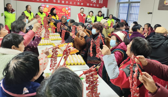活动现场暖意融融,洋溢着欢乐祥和的节日气氛。在手工制作糖果鞭炮环节,志愿者们耐心指导大家剪裁、粘贴、串联。一颗颗色彩鲜艳的旺仔糖果,经过长者们的巧手,变成了一串串精美喜庆的“鞭炮”。大家手捧自己的作品,脸上绽放出满满的成就感与幸福笑容。