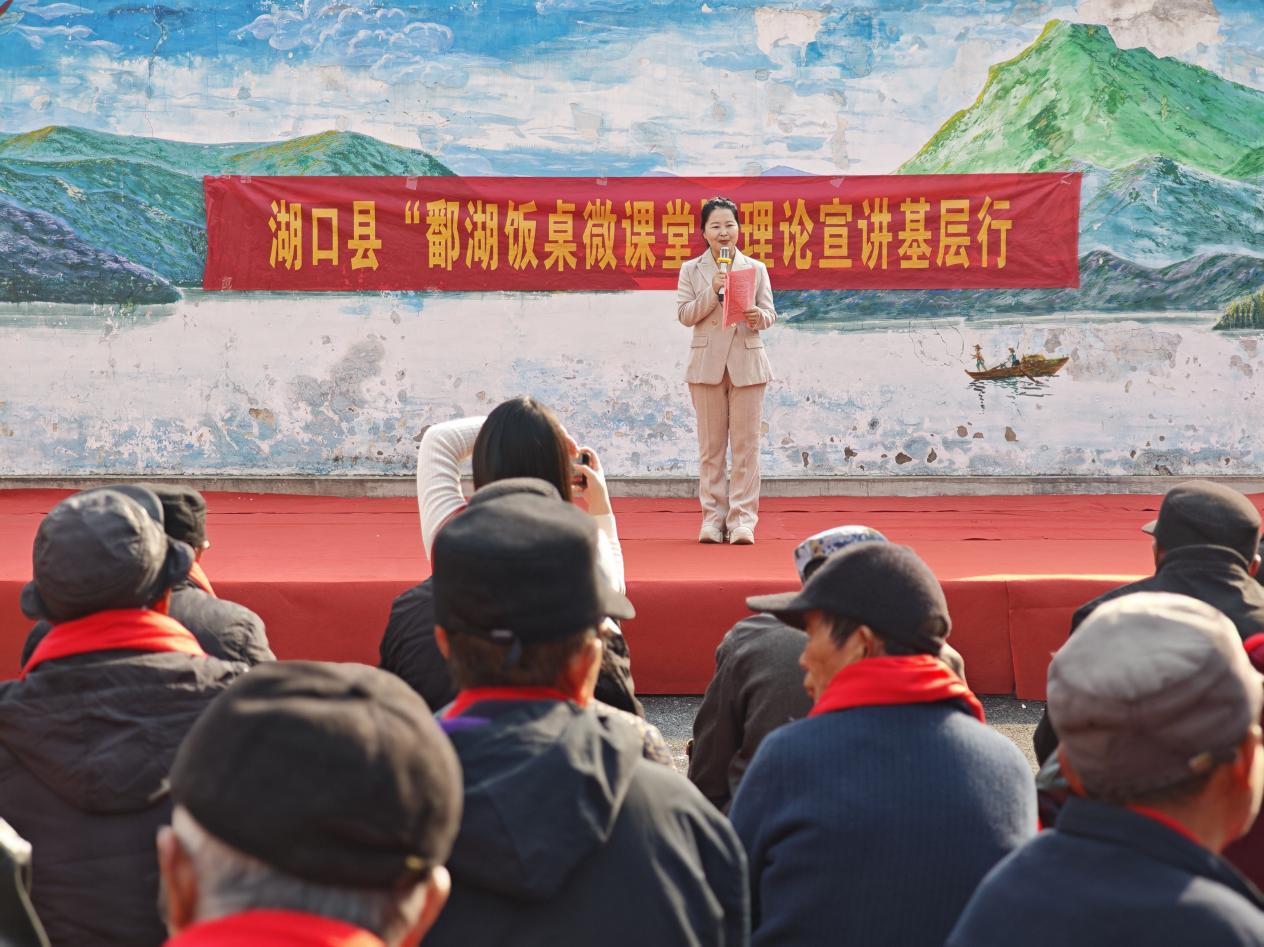 1月15日上午,湖口县张青乡泉水村新时代文明实践站内暖意融融、气氛热烈。县“鄱湖饭桌微课堂”理论宣讲基层行活动在这里生动开讲。本地网络主播“周周”化身宣讲员,以亲切乡音搭配鲜活网语,为150余名干部群众带来了一场接地气、冒热气的党的二十届四中全会精神宣讲。